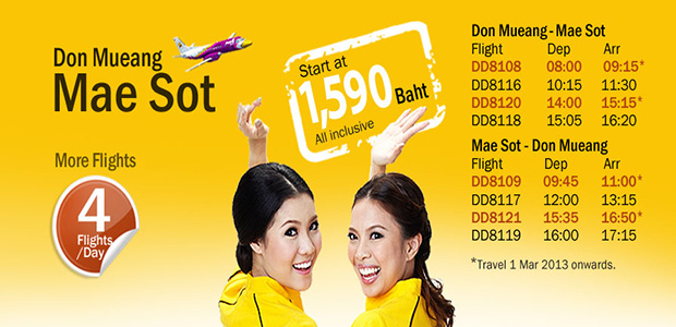 ท่านที่ต้องการเดินทางโดยเครื่องบิน สายการบินนกแอร์ จากกรุงเทพฯ มาลงที่ อ.แม่สอด ตามรายละเอียดด้านล่างค่ะ |